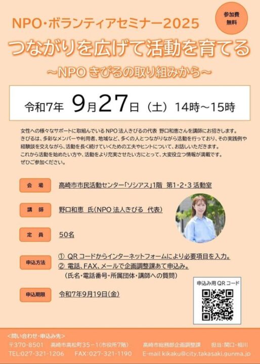 高崎市民活動センター「ソシアス」にて開催されました「NPO・ボランティアセミナー2025」に、当団体NPO法人きびるの代表理事、野口和恵が登壇いたしました。